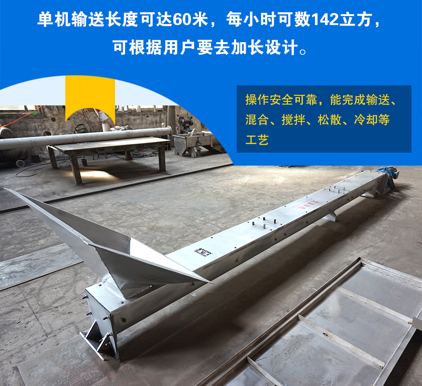 2、單機(jī)輸送長(zhǎng)度可達(dá)60米,每小時(shí)可數(shù)142立方,可根據(jù)用戶要去加長(zhǎng)設(shè)計(jì)。