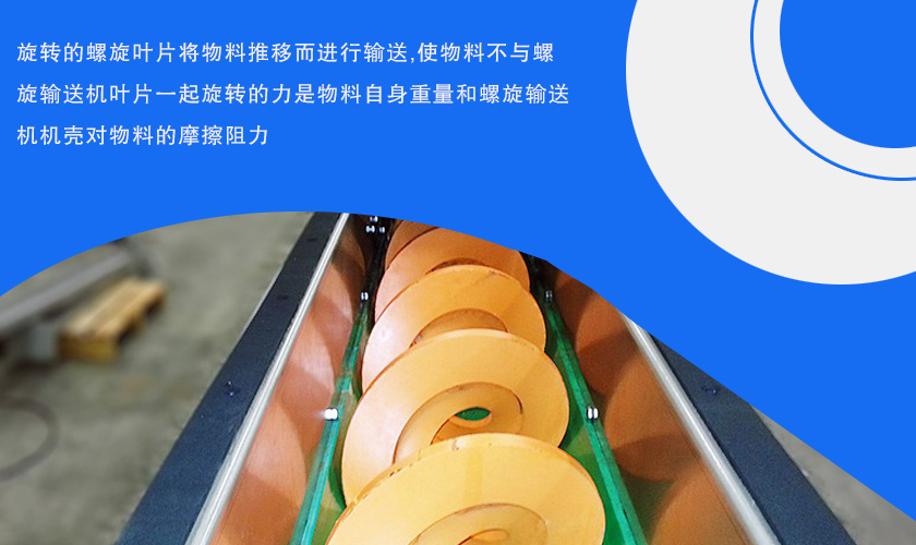 當(dāng)螺旋軸轉(zhuǎn)動(dòng)時(shí),由于物料的重力及其與槽體壁所產(chǎn)生的摩擦力,使物料只能在葉片的推送下沿著輸送機(jī)的槽底向前移動(dòng),其情況好像不能旋轉(zhuǎn)的螺母沿著旋轉(zhuǎn)的螺桿作平移運(yùn)動(dòng)一樣。物料在中間軸承的運(yùn)移,則是依靠后面前進(jìn)著的物料的推力。所以,物料在輸送機(jī)中的運(yùn)送,完全是一種滑移運(yùn)動(dòng)。為了使螺旋軸處于較為有利的受拉狀態(tài),一般都將驅(qū)動(dòng)裝置和卸料口安放在輸送機(jī)的同一端,而把進(jìn)料口盡量放在另一端的尾部附近。 旋轉(zhuǎn)的螺旋葉片將物料推移而進(jìn)行輸送,使物料不與螺旋輸送機(jī)葉片一起旋轉(zhuǎn)的力是物料自身重量和螺旋輸送機(jī)機(jī)殼對(duì)物料的摩擦阻力。葉片的面型根據(jù)輸送物料的不同有實(shí)體面型、帶式面型、葉片面型等型式。螺旋輸送機(jī)的螺旋軸在物料運(yùn)動(dòng)方向的終端有止推軸承以隨物料給螺旋的軸向反力,在機(jī)長(zhǎng)較長(zhǎng)時(shí),應(yīng)加中間吊掛軸承。