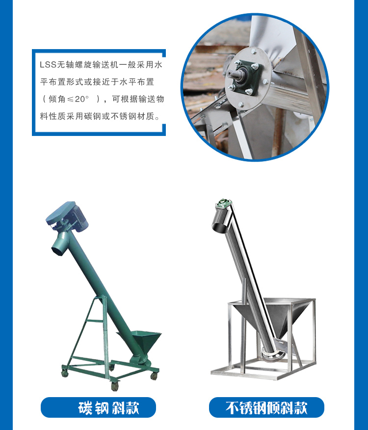 LSS無軸螺旋輸送機一般采用水平布置形式或接近于水平布置(傾角≤20°),可根據輸送物料性質采用碳鋼或不銹鋼材質。