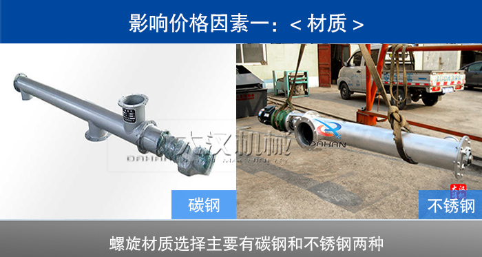 餐飲垃圾無軸螺旋輸送機的材質有碳鋼、不銹鋼兩種材質,不銹鋼材質的價格要貴1倍左右,不銹鋼的主要用于對輸送環境要求高的行業,清潔度高,不會污染物料,使用時間長,造價也相對高。碳鋼材質可以主要應用在一些對物料要求不是很嚴格或對,對于餐飲垃圾的輸送您選擇碳鋼材質即可,在價格上也能便宜不少。
