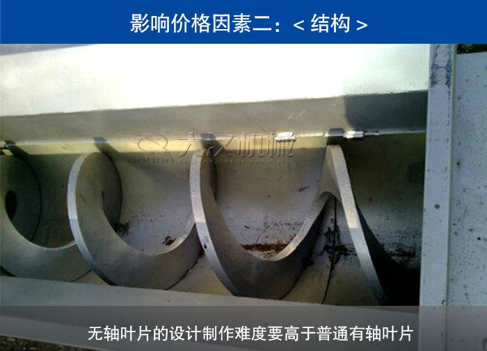 餐飲垃圾無軸螺旋輸送機在結構特點上其是有所差距的。其中明顯的就是中心軸分為有軸和無軸,雖然他們就只有一根螺旋軸的差距,但是價格還是有幾百甚至上千元的差異,具體差異要以型號差異為主。無軸葉片的設計制作難度要高于普通有軸葉片,所以在價格餐無軸螺旋輸送機要出不少。