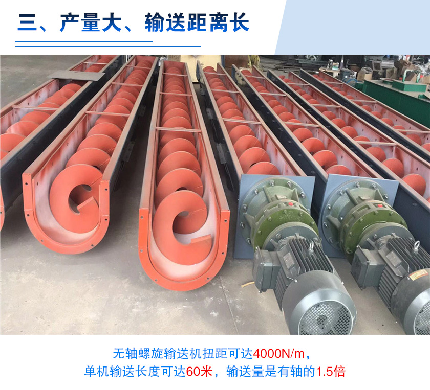 對于污泥輸送來說,用戶也比較關(guān)系設(shè)備的輸送效率,無軸螺旋輸送機(jī)扭距可達(dá)4000N/m,單機(jī)輸送長度可達(dá)60米,輸送量是有軸的1.5倍,另外還可根據(jù)用戶需要,采用多級串聯(lián)式安裝,對污泥進(jìn)行超長距離的輸送。